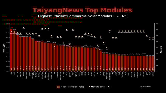 The latest edition of TaiyangNews’ Top Solar Modules, compiled in early November 2025, features 47 high-efficiency products – 2 fewer than in the previous month – from 33 companies, with Maxeon delisted due to product unavailability.