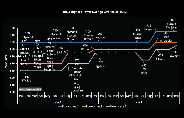 As for the next power category, Tongwei's 660 W PERC module held this place till July. In August, EGing's TOPCon module displaced 8 PERC products with 670 W power from the 2nd place, which itself was relegated to 3rd with Akcome's HJT module ranking 2nd in December. However, EGing replaced this high-power module with a high-efficiency one, but with a lower power rating of 580 W. As a result, one PERC module each from Canadian Solar and Risen were elevated to a shared 3rd position, but only for the months of July and August. With the introduction of Huasun's 715 W module, Akcome's HJT module slipped to the 3rd place, but the company also increased the power ratings for this product range in December 2023.