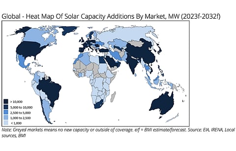 Citing the global support for solar strengthening in H2/2023, BMI analysts have revised their cumulative solar PV installation forecast for 2032. As against 2.99 TW pegged earlier, BMI now expects the world's total installed solar power capacity to reach about 3.8 TW by 2032 (including 10.2 GW of concentrated solar power (CSP)), up from 1.32 TW by 2023-end, in its commentary Global Solar Power Forecast: Further Upward Revision For Solar And Increased Opportunities For The Sector.