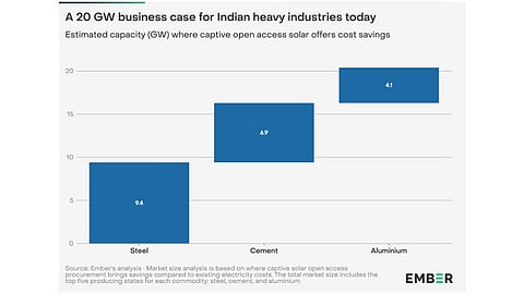 Nearly 40% of the 20 GW open access solar power opportunity for heavy industries is concentrated in the industrial states of Odisha and Chhattisgarh, known for their steel and aluminum production, according to the Ember report. Here, open access solar/renewable energy is a commercially viable sourcing option for these industries, stress the writers.