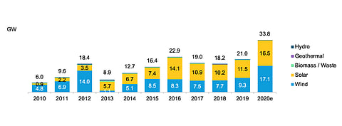 In the year 2020, the US installed 33.6 GW of wind and solar power capacity. While wind claimed a 17.1 GW stake, solar added 16.5 GW, contributing to renewable energy's share in the national power grid rising 11% YoY. Renewable energy generated a 5th of the country's power in 2020, claims the 9th edition of Sustainable Energy in America Factbook.