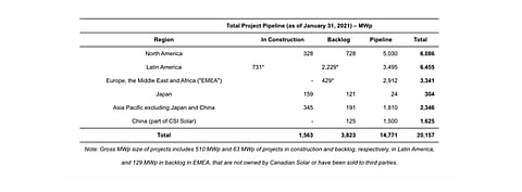 At the end of 2020, Canadian Solar's total solar project pipeline grew to over 20 GW, and close to 9 GWh of battery storage pipeline. In 2021, it expects to deliver and capture approximately 10% market share in battery storage space in the US.