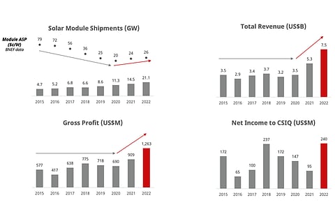 Results in the 4th quarter were attributed to higher solar module shipment volumes, partially offset by small decline in module ASPs. Management experienced drop in both material and logistical costs during the quarter. "The fourth quarter of 2022 was impacted by the timing of project sales, as expected, and adjustments in our growth strategy to hold valuable solar assets for the longer term," said Canadian Solar's Corporate VP and President of Global Energy subsidiary, Ismael Guerrero.