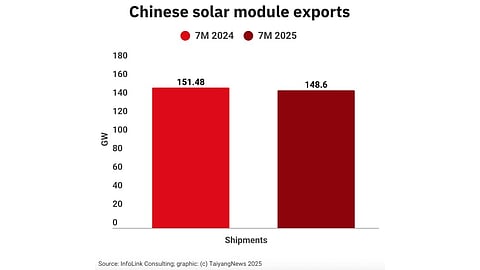 China’s solar module exports rose 8% year-on-year (YoY) in July 2025, reaching nearly 21.25 GW, InfoLink Consulting has reported. Shipments from January to July totaled 148.6 GW, down 2% from the same period in 2024, with Europe receiving about 47% of the volume.