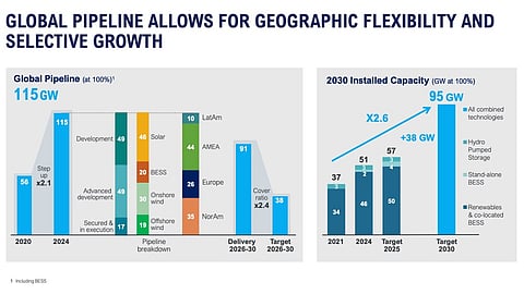 The targeted increase is backed by its global pipeline of 115 GW, comprising 46 GW of solar, 30 GW onshore wind, 19 GW offshore wind, and 20 GW BESS. Most of it is located in the Asia Pacific, Middle East & Africa (AMEA) region, followed by North America, Europe and Latin America.