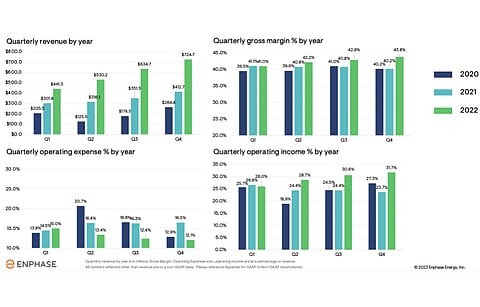 US based solar microinverter and battery supplier Enphase Energy, Inc has reported a strong Q4/2022 with a 'record' quarterly revenue of $724.7 million reflecting an annual improvement of more than 75%, contributing to its annual revenues for 2022 growing more than 68% to $2.3 billion.