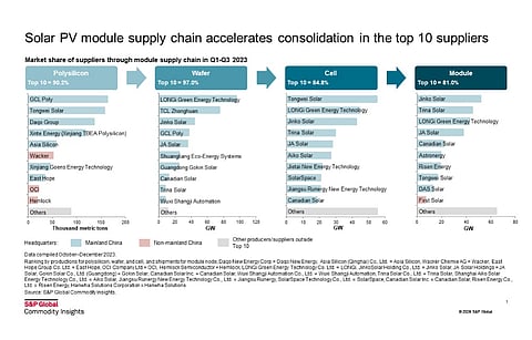 The world's top 10 suppliers controlled over 80% of the global solar module supply chain during 9M/2023, with only 4 manufacturers among the top 10 are headquartered outside of mainland China, according to the S&P Global Commodity Insights.