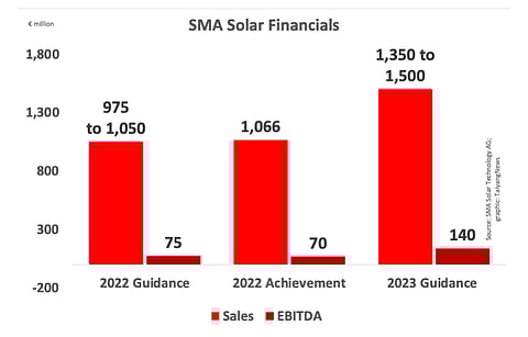 Its sales for the reporting year improved 8.4% YoY to €1.06 billion, which means it exceeds the revised guidance of €975 million to €1.05 billion 'despite pronounced procurement supply shortages' (see SMA Solar Revises Annual Earnings Forecast For 2022).