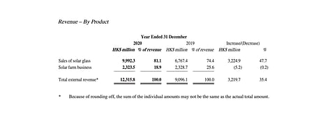 To this group revenue, solar glass sales added HKD 9.99 billion with most of it sold within China, reflecting an annual growth of 55.8% in China and 26.1% 26.1% overseas. The management added overseas sales accounted for 23.5% of the group's total solar glass sales in 2020. The solar farm segment added revenues of HKD 2.32 billion.