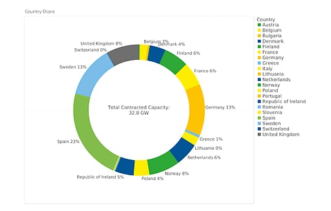 The cumulative contracted capacity now stands at 32.8 GW, with Spain accounting for 23% share. Sweden and Germany both take 13% share, while the UK and Norway each represent 8% share. Solar energy scores over wind, wind and solar and other renewables.