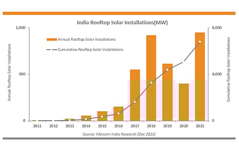 The year 2021 was so far the best year for rooftop solar installations in India. Mercom India Research said that the annual addition of 1.7 GW last year was the highest ever recorded for the segment in a single calendar year (CY), taking cumulative to 7 GW. The addition of 1.7 GW was up 210% over CY2020.