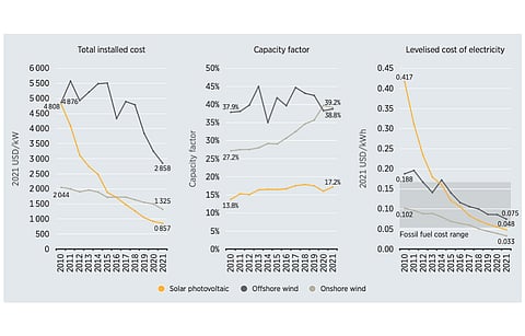 For utility scale solar PV projects, between 2010 to 2021, the global weighted average LCOE went down by 88%, for onshore wind by 68% and offshore wind by 60%.