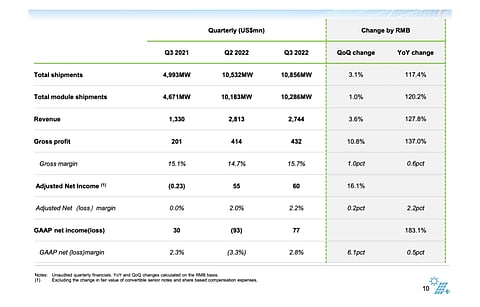 The Chinese company's mass-produced production line for TOPCon cells reached full capacity of 16 GW, and phase II of 8 GW TOPCon cell capacity in the manufacturing facility in Hefei is ramping up. It also provided an update to the company's 11 GW TOPCon cell capacity in Jianshan is expected to start production by the end of 2022. All of these efforts are aimed at optimizing the company's integrated capacity structure and drive down blended costs.