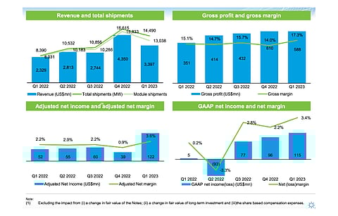 Yet on an annual basis, it registered a growth of 72.7% in shipments and 58% in revenues. Gross profit of $588.4 million dropped 4% QoQ and increased 81.5% YoY. Gross margin was 17.3% compared with 14% in Q4/2022 and 15.1% in Q1/2022 (see JinkoSolar's Q1/2022 Financial Results).