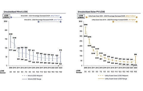 For unsubsidized solar PV, the LCOE ranged between $24/MWh to $96/MWh in 2023, having gone up from $30/MWh to $41/MWh in 2021.