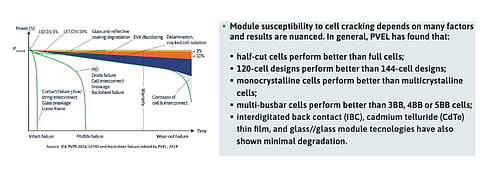 In its 2021 PV Module Reliability Scorecard, the 7th annual edition of this research report, PVEL counts 26% of the BOMs eligible for this year's scorecard had at least 1 failure as compared to 20% in 2020 (see PVEL Releases 2020 Module Reliability Report). The greatest number of failures occurred during the mechanical stress sequence to check how the module would fare under extreme weather. PVEL said it included this test recently to its Product Qualification Program (PQP) to address durability concerns.