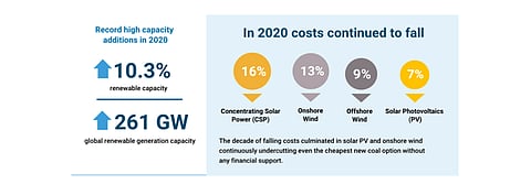 Cost reduction of renewables continues with annual reduction of 7% alone seen for solar PV technology in 2020 which means renewables like solar PV can 'undercut' existing operational costs as well, it claims. Competitive auctions are also bringing down costs for solar PV and onshore wind which continuously undercut even the cheapest new coal option without any financial support.