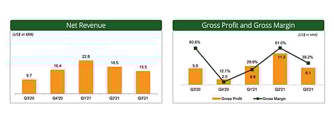 Gross profit for the quarter was $6.1 million with a gross margin of 39.2%, compared to $11.3 million and 61% in Q2/2021 and $5.9 million and 60.6% in Q3/2021, respectively.
