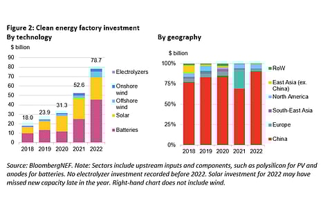 Clean energy factory investments totaled $78.7 billion in 2022 having grown from $52.6 billion in 2021 with battery and related component manufacturing attracting $45.4 billion. Solar PV manufacturing factories attracted $23.9 billion. China accounted for 91% of manufacturing investments last year. The report only factors in successfully commissioned factory projects for the report.