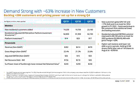 US residential solar installer SunPower Corporation has reiterated its previous guidance for 2022 expecting a customer growth between 73,000 to 80,000 after it exited Q3/2022 having added 23,100 new ones, a 63% annual growth riding on high demand.