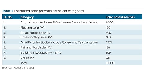In the Reassessment of Solar Potential in India: A Macro-level Study, TERI finds the largest chunk of this potential capacity at 4.91 TW to come from ground-mounted solar PV on barren and unculturable land, and another 4.18 TW from agrivoltaics (agri-PV) for horticulture crops, coffee, and tea plantations. Rural rooftop solar can contribute 600 GW, urban rooftop PV 360 GW, and floating solar 100 GW.