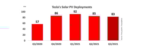 EV giant and solar power company Tesla, Inc. increased its annual solar PV deployments by 71% to 83 MW in Q3/2021, up from 57 MW it reported a year back. On sequential basis however, it was a drop of 2 MW.