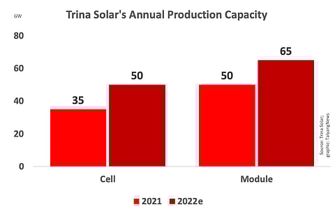 At the end of 2021, Trina's solar cell production capacity had reached up to 35 GW and module capacity 50 GW as targeted. By the end of 2022, it now targets to expand solar cell capacity to 50 GW and module capacity to 65 GW. In 2022, it plans to ship 43 GW modules, including those for self-use. Management said it is actively exploring the layout of TOPCon production capacity.