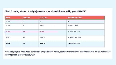 Speaking about the scenario, E2 Communications Director Michael Timberlake said, “The loss of these projects isn’t just a setback for clean energy - it’s a setback for America’s workers and competitiveness. For every cancelled factory or downsized plant, behind the scenes many more projects are not being announced at all as more capital flees and businesses look overseas to invest instead. That means fewer paychecks, less local investment, and fewer opportunities for US workers to lead in the industries of the future. While other nations are racing ahead to capture the clean energy economy, these cancellations leave American communities falling further behind.”