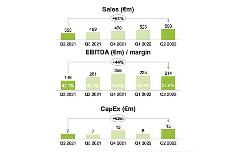 Strong demand and high ASPs for solar-grade silicon led to Germany's Wacker Chemie AG reporting 61% annual increase in polysilicon sales for Q2/2022, contributing over 26% of group sales even as higher energy and raw material prices pulled down its EBITDA by 5% sequentially.