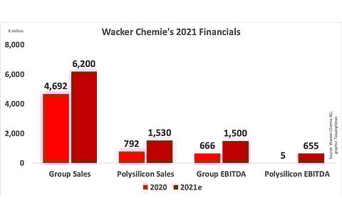 Group sales are expected to be €6.2 billion ($6.9 billion) to which polysilicon contributed €1.53 billion ($1.7 billion), having gone up from €792 million in 2020 (see Wacker's Polysilicon Sales Up, But Group Sales Down).
