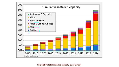The cumulative global utility-scale solar PV capacity has reached almost 800 GW AC or 1,000 GW DC with new deployments of 182.7 GW AC in 2024, according to Wiki-Solar that maintains the world’s utility-scale solar database.