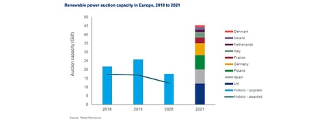 In a new report titled European power markets: 5 things to look for in 2021 Wood Mackenzie analysts claim the continent has as much as 45 GW of renewable energy capacity to be auctioned in 2021, comprising 17 GW of wind and 6 GW of solar PV alone. Remaining capacity is either technology neutral or related source.