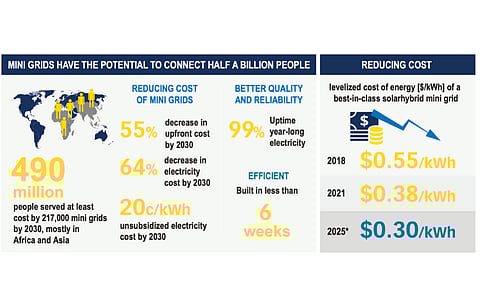 Calling solar mini grids a 'core solution' for closing the energy access gap whose cost of electricity generation has dropped from $0.55 per kWh in 2018 to $0.38 per kWh now, a World Bank report sees these having the potential to serve 490 million people by 2030 for a cumulative cost of $127 billion.