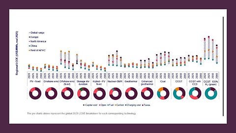 Asia Pacific sees utility-scale solar LCOE ($27/MWh to $118/MWh) and onshore wind ($25/MWh to $70/MWh) as the cheapest options by 2025