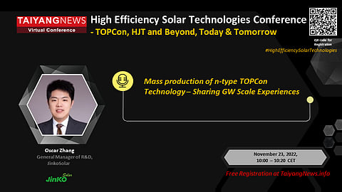 Jinko at 23-25 November TaiyangNews Conference: TaiyangNews is happy to host Oscar Zhang, General Manager of R&D JinkoSolar, at the 3-Day TaiyangNews Virtual Conference on High Efficiency Solar Technologies—TOPCon, HJT and Beyond, Today & Tomorrow. He will be addressing the topic: Mass Production of n-Type TOPCon Technology – Sharing GW Scale Experiences. Our 3-Day Flagship Event, taking place online from 23-25 November 2022 from 9:30 CET, will provide the latest update on commercial high-efficiency cell technologies – from Passivated Contacts (TopCon) to Heterojunction (HJT) and also next-gen cell technologies. Do join us. For free registration, click here.