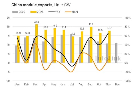 InfoLink Consulting's latest Chinese solar module shipment data shows the country's solar module exports of almost 18 GW during November 2023 had Asia Pacific as the largest buyer. The latter replaced Europe from the top spot.