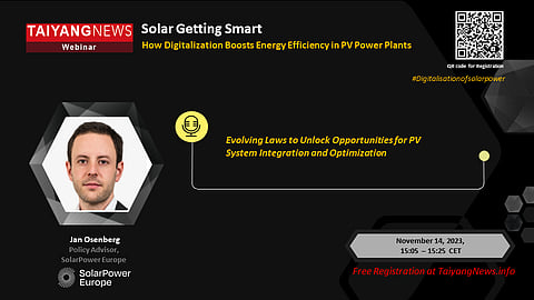 TaiyangNews Special Focus Webinar On Nov 14, 2023: TaiyangNews is excited to announce the presence of Jan Osenberg, Policy Advisor SolarPower Europe at its Special Focus Webinar: Solar Getting Smart on November 14, 2023, from 15:00 -16:30 CET. He will be addressing the topic: Evolving Laws to Unlock Opportunities for PV System Integration and Optimization.