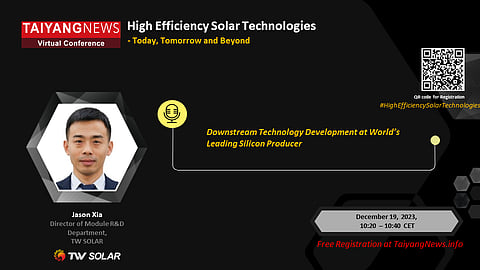 TW Solar at TaiyangNews annual flagship event Day 3: TW Solar's Director of Module R&D Department Jason Xia will participate in Part-2 of TaiyangNews annual flagship event – a #VirtualConference on High Efficiency Solar Technologies – Today, Tomorrow and Beyond, scheduled for December 19/20 from 09:30 – 13:00 CET.