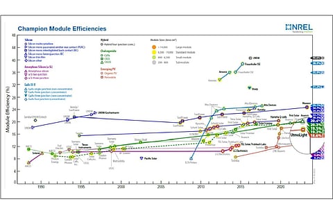 UtmoLight's perovskite module efficiency included in NREL efficiency charts: China based solar technology company Wuxi Utmost Light Technology Co Ltd said via WeChat that the steady-state efficiency of its 18.6% (809.9cm²) large-scale perovskite modules has been included in the latest version of NREL's Champion Module Efficiencies Photovoltaic Modules world record chart. This is the second time this efficiency has been affirmed by an international authoritative organization. Prior to this, the efficiency was also featured in Martin Green's Solar Cell Efficiency Tables Photovoltaic Efficiency world record list. Earlier this month, Germany's TÜV SÜD had certified UtmoLight's 17.18% efficiency claim for mass-produced perovskite mini module (see Perovskite Commercial Efficiency Milestone).