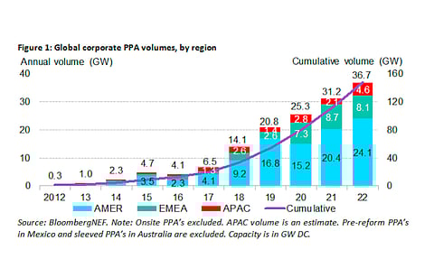 "Corporate clean energy buying has been an unwavering constant even as other aspects of ESG investing have come under scrutiny", said BloombergNEF's Head of Sustainability Research, Kyle Harrison. "Companies can access clean energy at scale in most major countries, the economics make sense, and amid turbulent energy markets, PPA's have become useful risk-mitigation tools for CFO's."