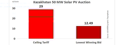 In October 2018, Kazakhstan held its first solar power auction awarding 170 MW to JSC Hydro, Avelar and Shell. The lowest winning bid came in at KZT 18.6 ($0.051) per kWh (see Kazakhstan Awards 170 MW PV In 1st Solar Auction).