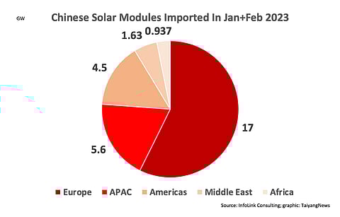 Having imported 86.6 GW solar modules from China in 2022, the largest for any geographical region last year, Europe continues to be the Asian giant's largest overseas market procuring 17 GW during 2M/2023, again the largest volume compared to the rest, according to Chinese customs data studied by InfoLink Consulting (see China Exported 154.8 GW Solar Modules In 2022).