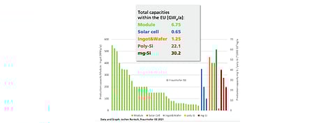 At the end of 2020, Europe had an annual c-Si PV module manufacturing capacity of 6.75 GW, 0.65 GW of solar cell, 1.25 GW of ingot and wafer, 22.1 GW polysilicon and 30.2 GW of mg-Si. Production facilities for solar cells are presently being expanded at a current rate of about 1 GW annually, it added.