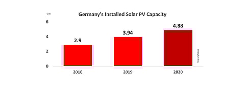 Germany officially breached the 4 GW milestone for the year 2020 and nearly even touched the 5 GW level. Its total installed solar PV capacity for the year reached 4.88 GW, according to the country's regulator Bundesnetzagentur. This is well above 1 GW additional capacity the country has reported after closing 2019 with 3.94 GW (see German PV Market Grows To 3.94 GW In 2019). In 2018, the market added 2.9 GW.