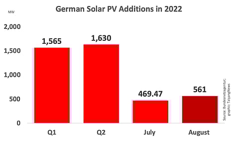 New solar PV additions in the month of August 2022 in Germany were a total of 561.35 MW taking the country's installed PV capacity between January 2022 and August 2022 to 4.22 GW, according to Bundesnetzagentur or the Federal Network Agency. That leaves 2.78 GW to go for the last 4 months of the year to reach the government's 7 GW installation target for 2022.