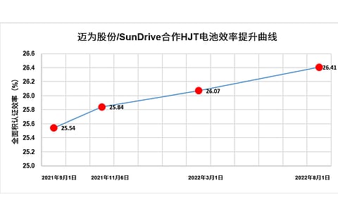 Mawell/SunDrive's latest HJT efficiency comes very close to the HJT record from LONGi Solar, which reported to have achieved 26.5% power conversion efficiency for its silicon heterojunction solar cell on a 274.4 cm2 M6 full size monocrystalline silicon wafer in June 2022 (see 26.5% Efficiency Record For M6 Silicon HJT Solar Cell). LONGi's HJT efficiency is the highest for any M6 cell device and comes close to the world record for any single-junction silicon solar cell from Kaneka, which produced a 26.7% efficienct HJT back contact cell in 2017, but that was a much smaller cell size of 79 cm2. Kaneka also produced a larger HJT back contact cell at 179 cm2 with 26.6% efficiency.