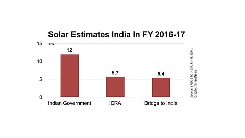 The Indian solar market may just add 5.4 GW of new solar power capacity in the current financial year, as against the 12 GW target set by the Indian government. While consultancy Bridge to India's forecast means more solar for the country than the 3 GW installed last fiscal year, it is even a little less than an estimate of another consultancy, ICRA, which predicts India to grow by 5.7 GW in 2016-17 (see ICRA estimates 5.7 GW of solar by 2017 in India).
