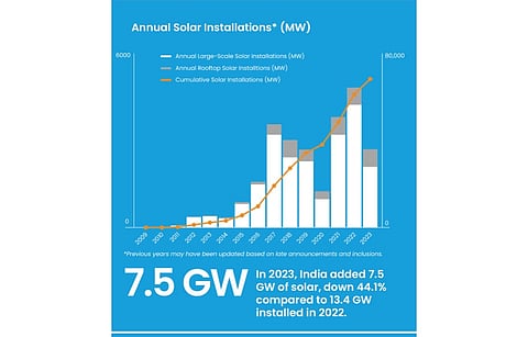 It says the country's total solar capacity addition in calendar year (CY) 2023 declined 44.1% annually to 7.5 GW, but accounted for 48.5% of new power capacity additions in the country last year.