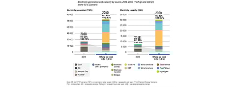Of the 90% of all electricity that IRENA expects renewables to provide in its 1.5°C scenario in 2050, solar PV and wind power alone account for 63%. "This rise is being accelerated by declining costs: three-quarters of onshore wind and 40% of utility-scale solar PV commissioned in 2019 will produce during their lifetime electricity cheaper than any fossil-fuel alternatives, while three-quarters to four-fifths of the onshore wind and utility-scale solar PV commissioned in 2020 from auction or tenders had prices lower than the cheapest new fossil fuel–fired option," reads the report.