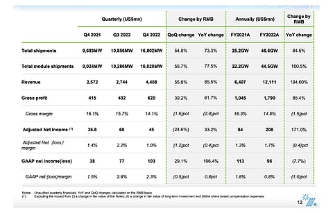 In Q4/2022, phase II of the company's 8 GW TOPCon cell capacitu in Hefei reached full production, and phase II of 11 GW TOPCon cell capacity in Jianshan is expected to reach full production in March 2023. "With our 35 GW of cell capacity gradually reaching full production, our integrated capacity structure continues to optimize, which will lower our blended costs," added Li.